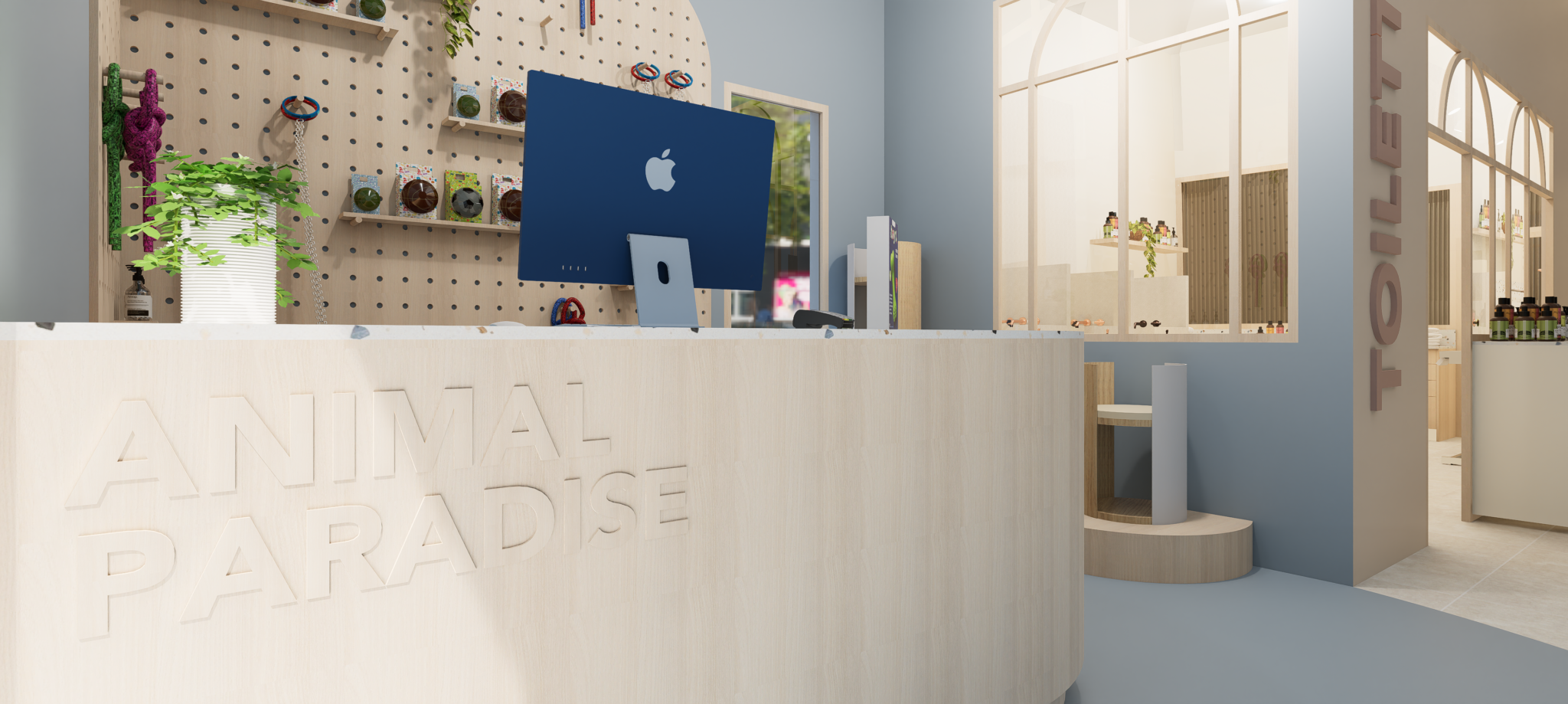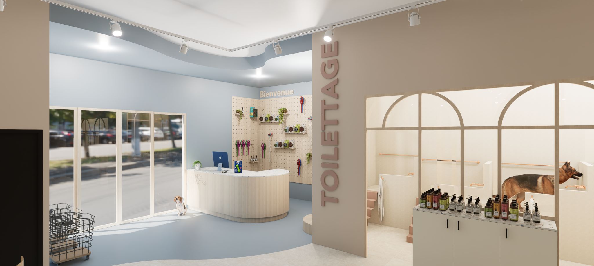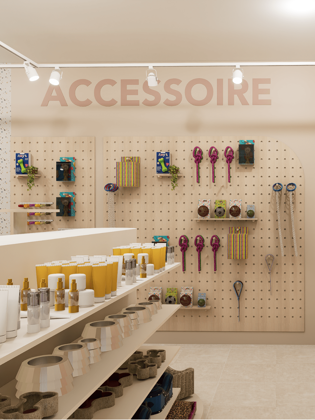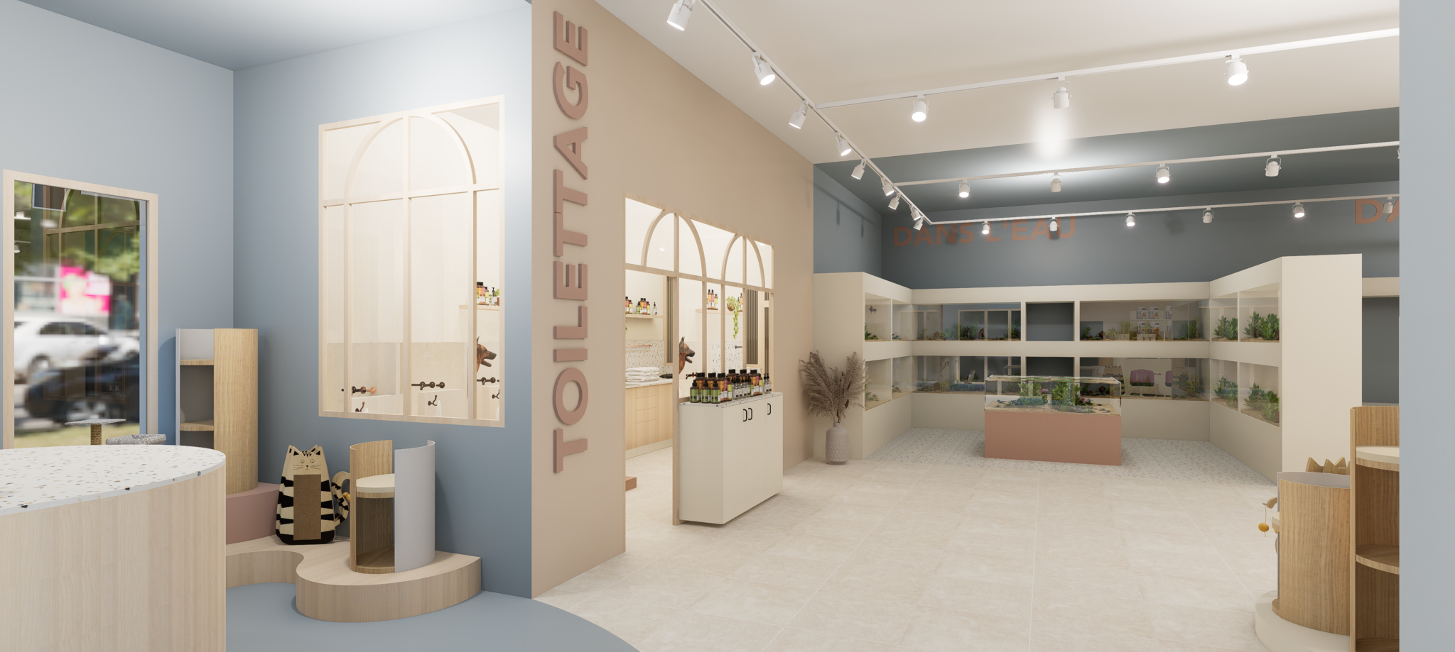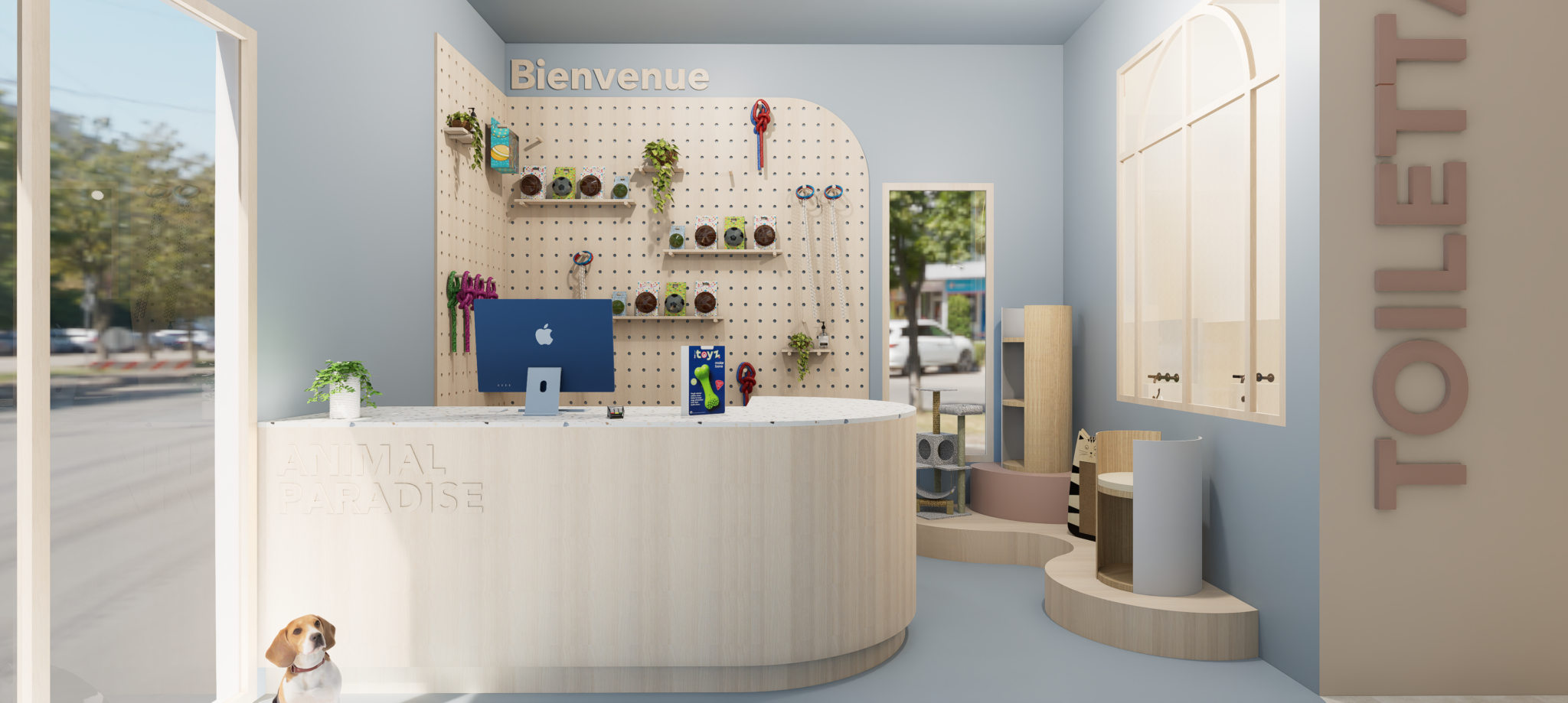 Nous avons conçu l’agencement sur mesure d’une animalerie, organisée en plusieurs espaces : vente d’accessoires et de nutrition, univers aquarium avec mobilier adapté, et espace toilettage pour enrichir l’offre de services.