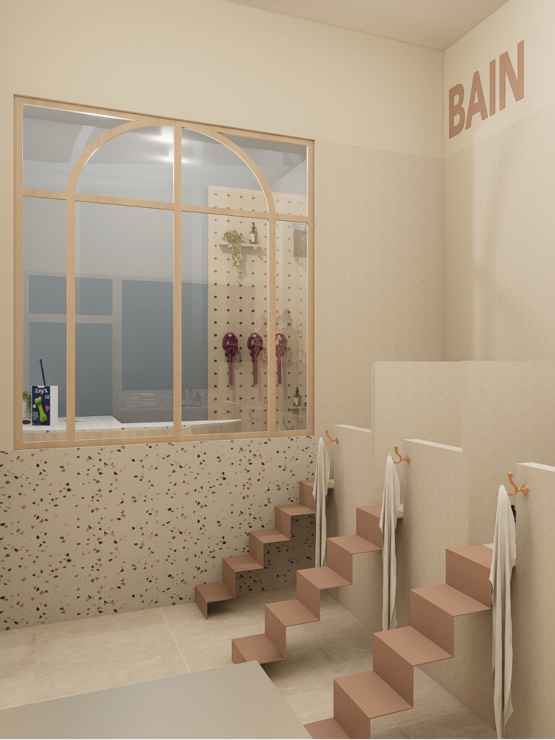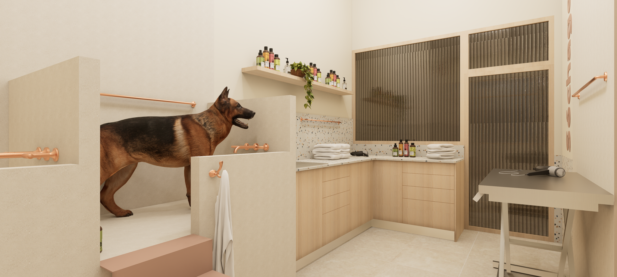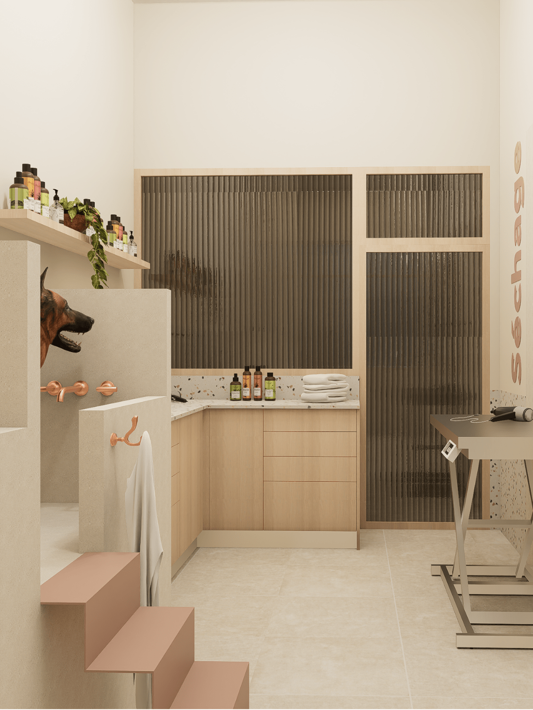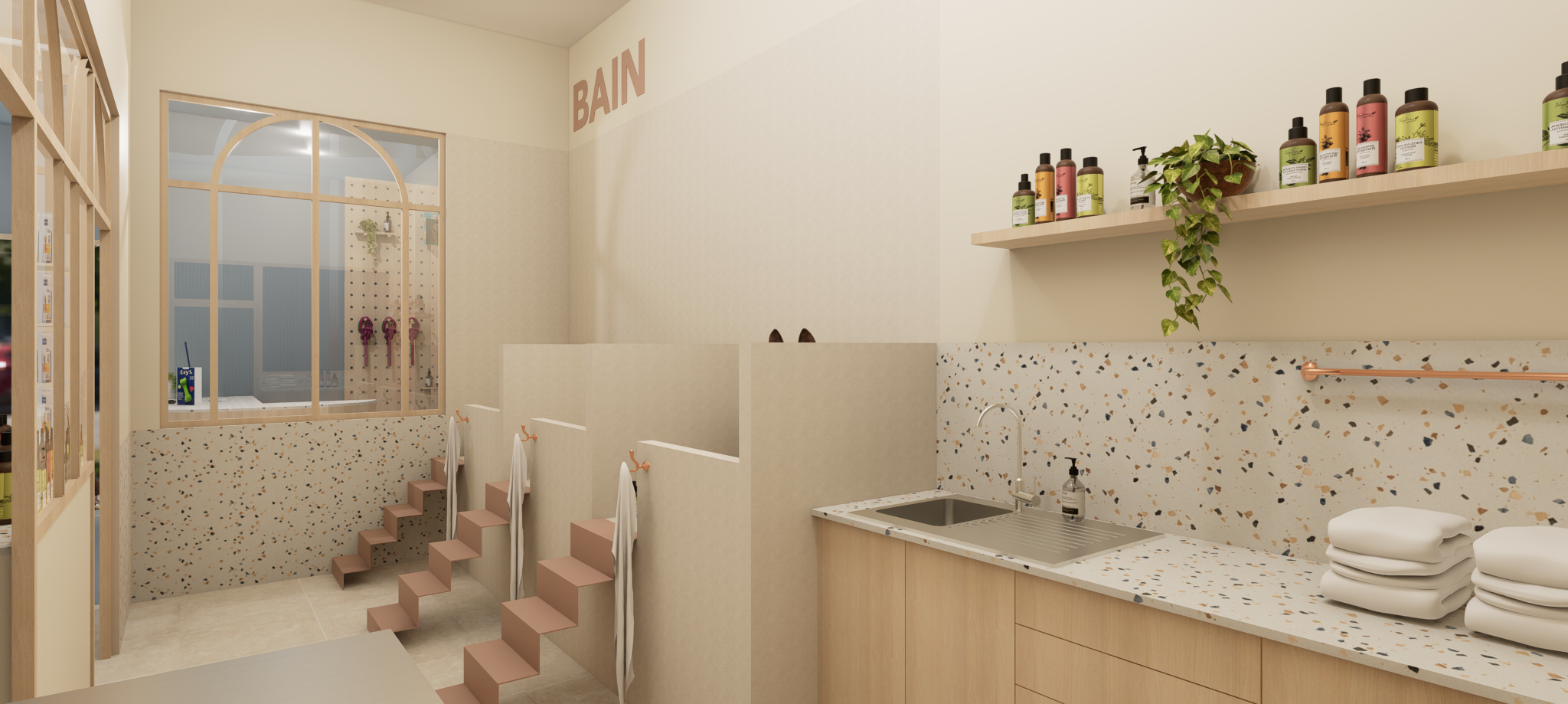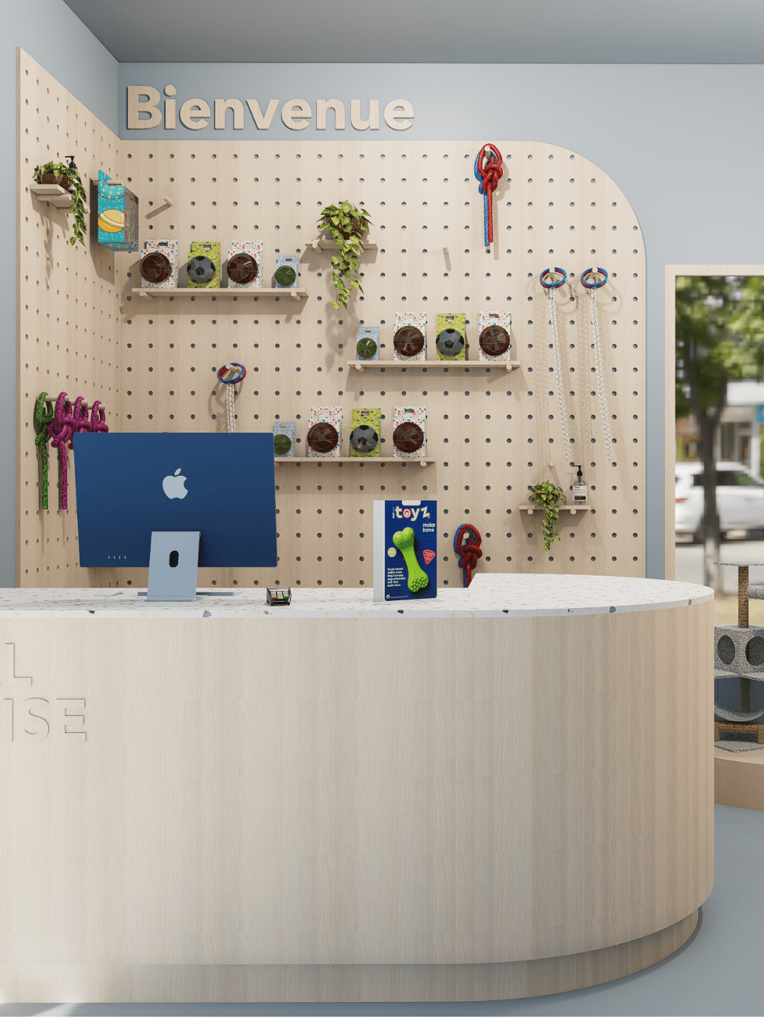 Nous avons conçu l’agencement sur mesure d’une animalerie, organisée en plusieurs espaces : vente d’accessoires et de nutrition, univers aquarium avec mobilier adapté, et espace toilettage pour enrichir l’offre de services.