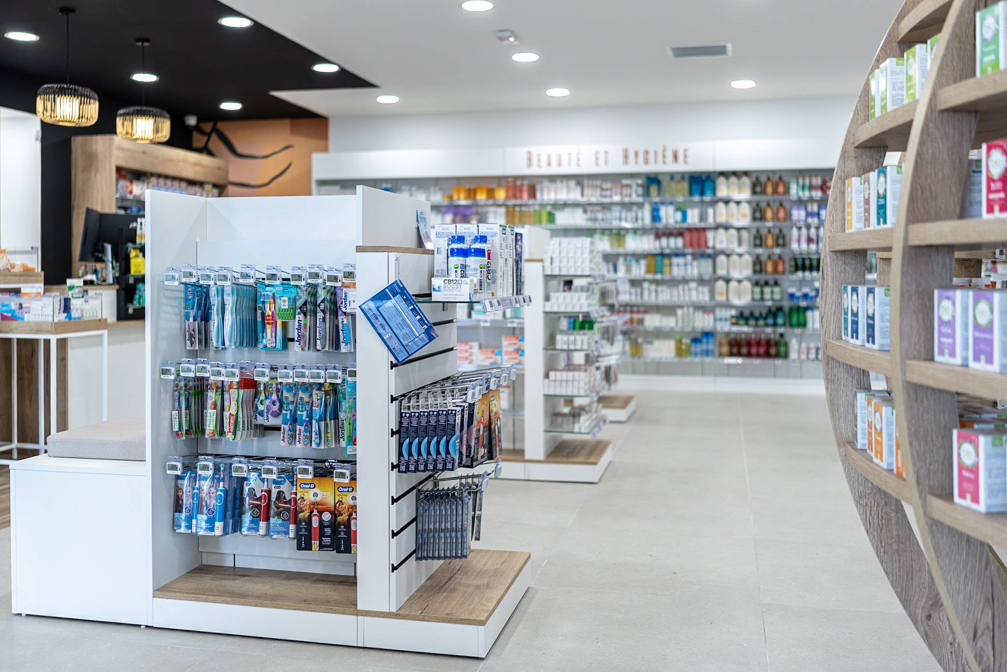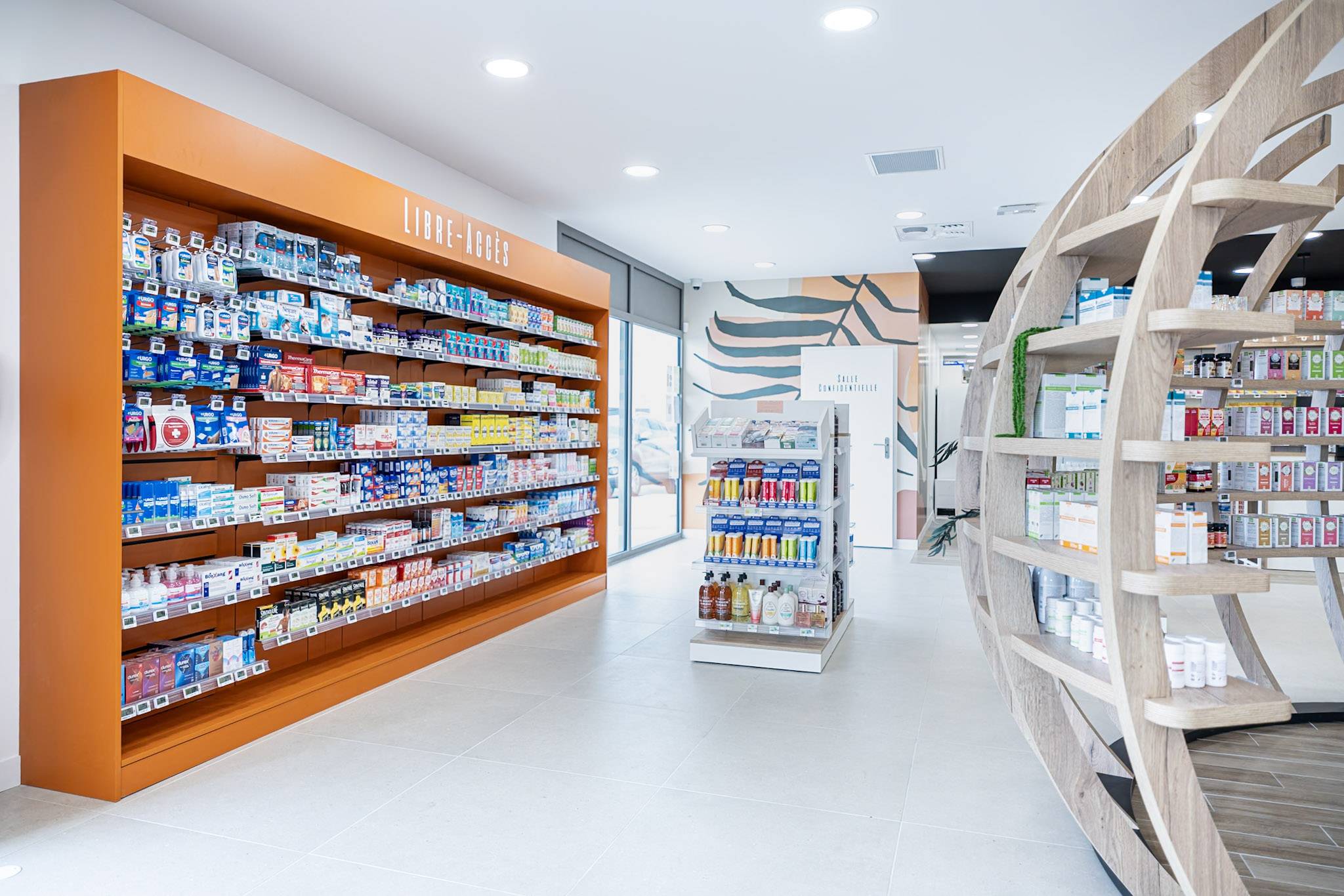 Une signalétique claire guide les clients à travers les différents pôles de l’officine, pour une expérience client plus fluide.